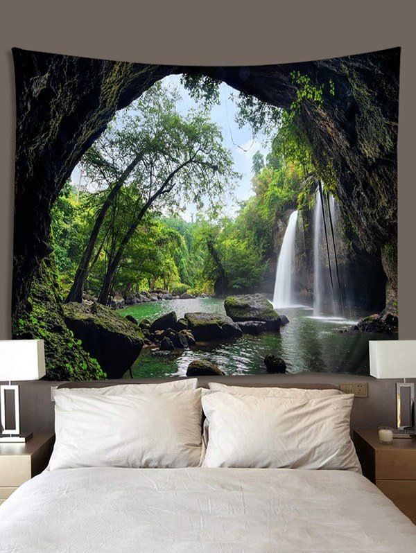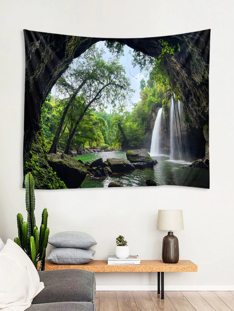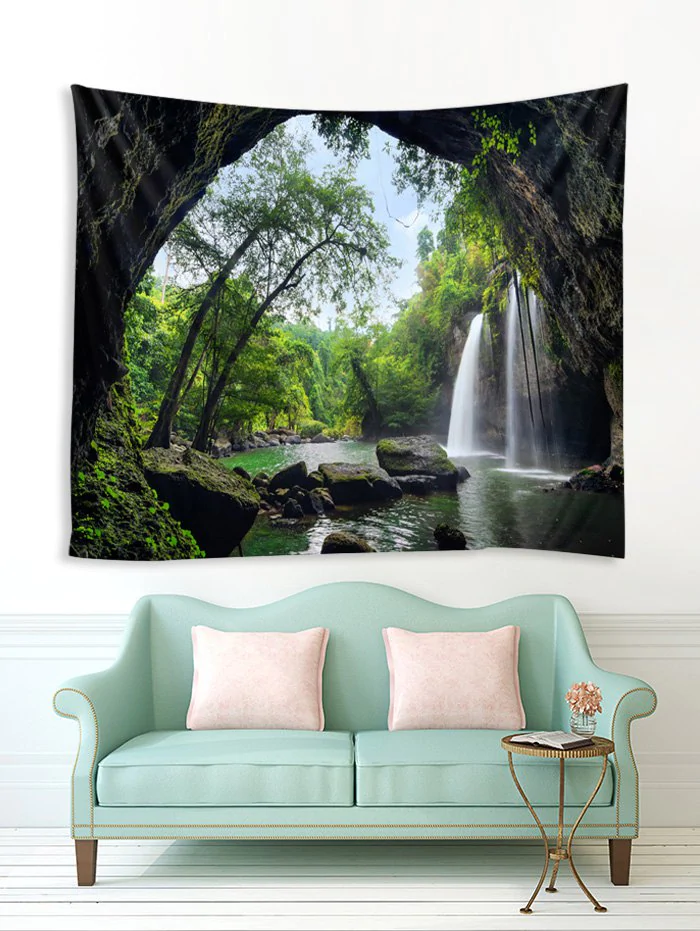 Printed Waterfall Tree Cave Brushed Tapestry