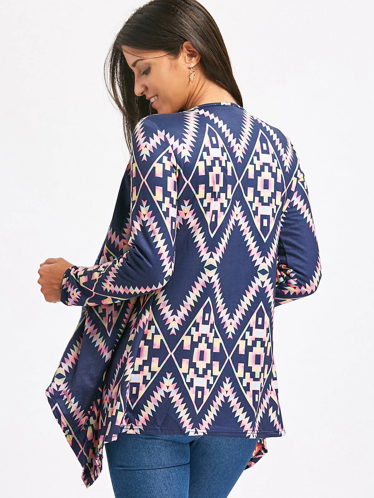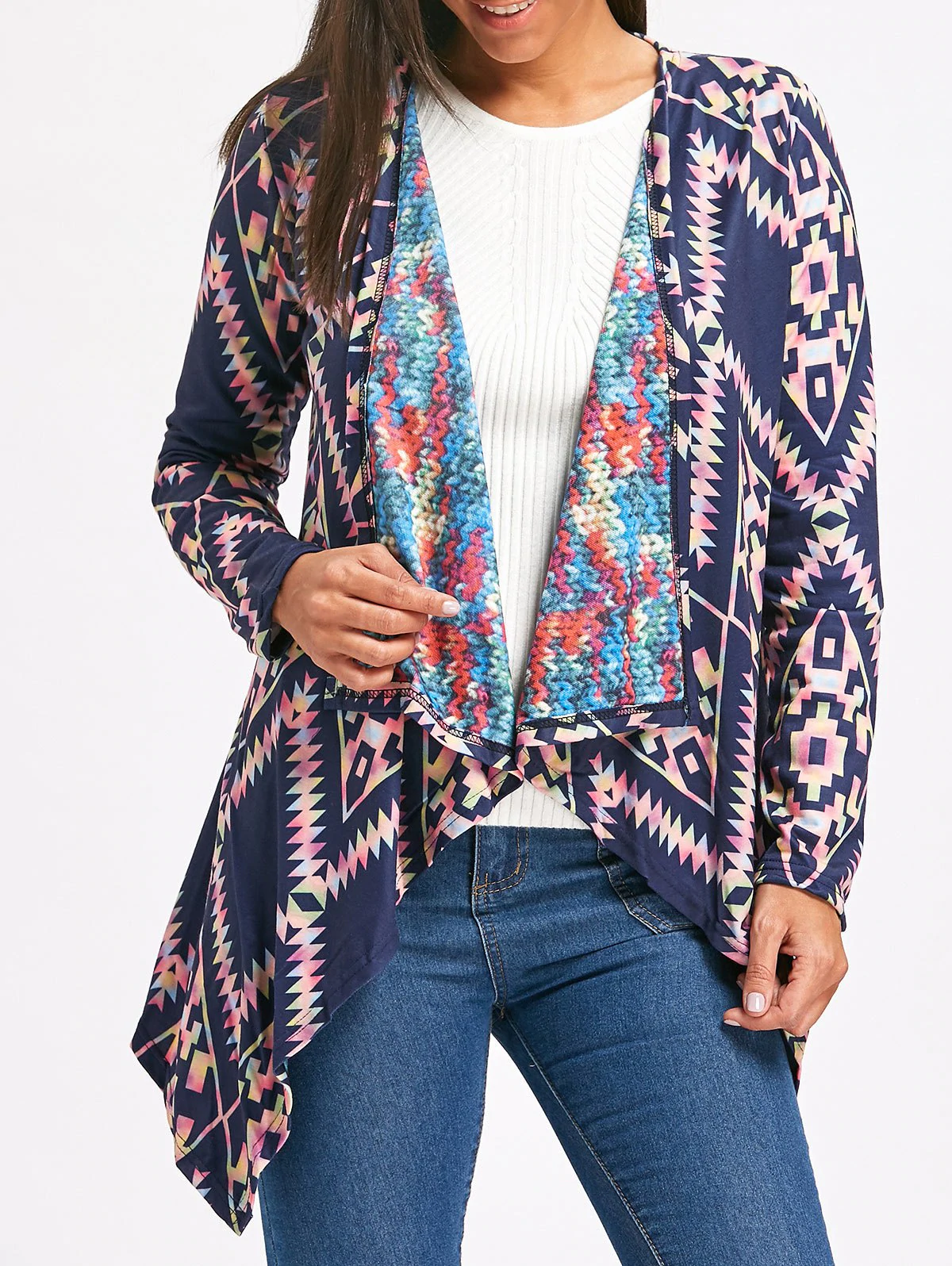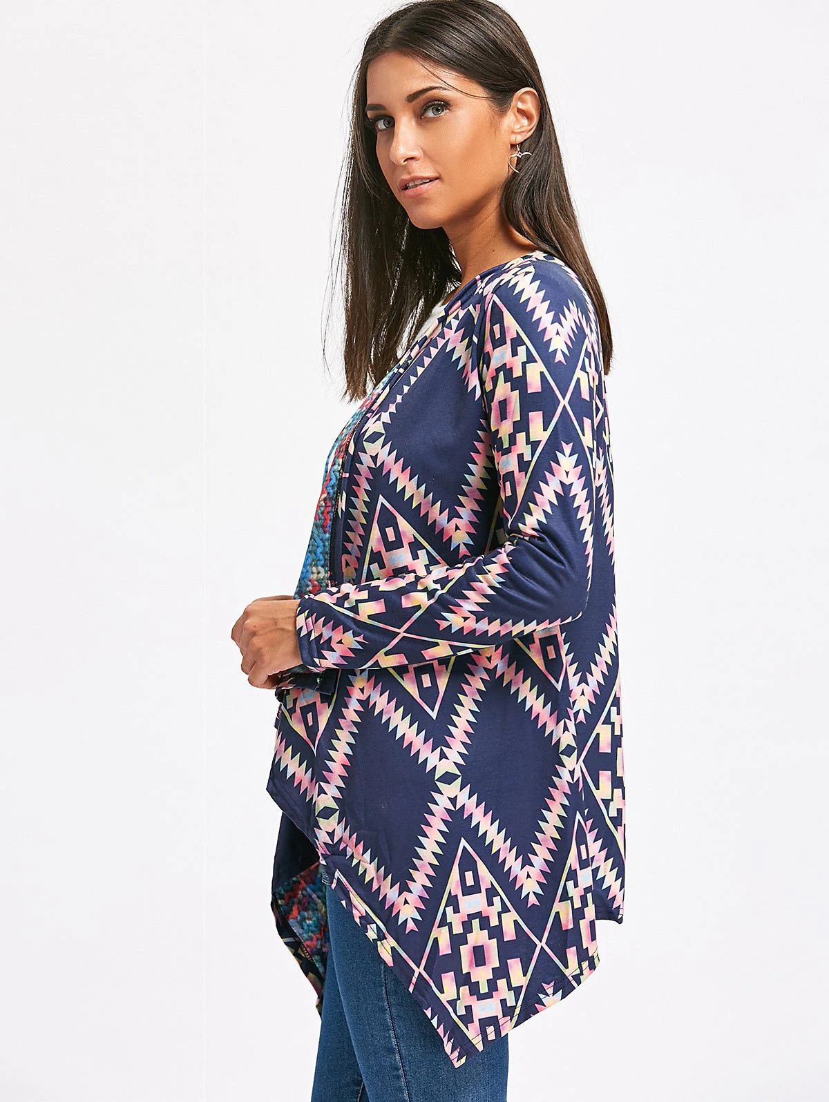 Retro Style Long Sleeve Collarless Ethnic Print Loose-Fitting Wo