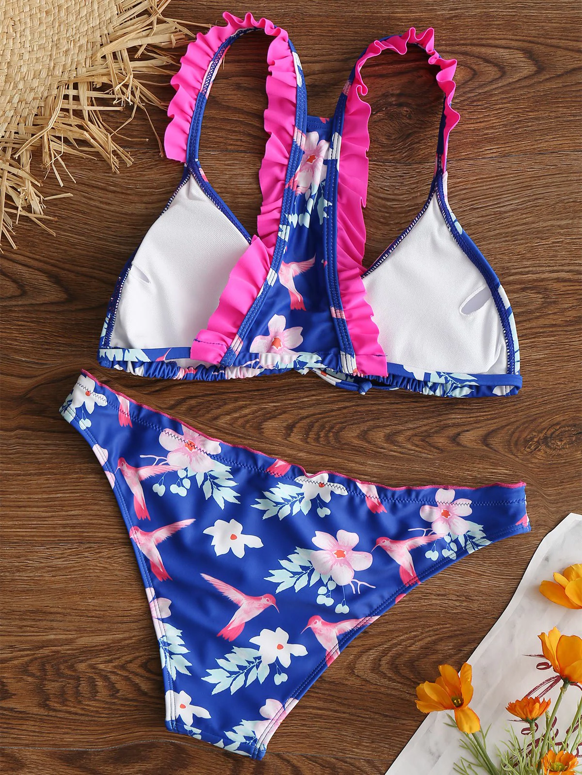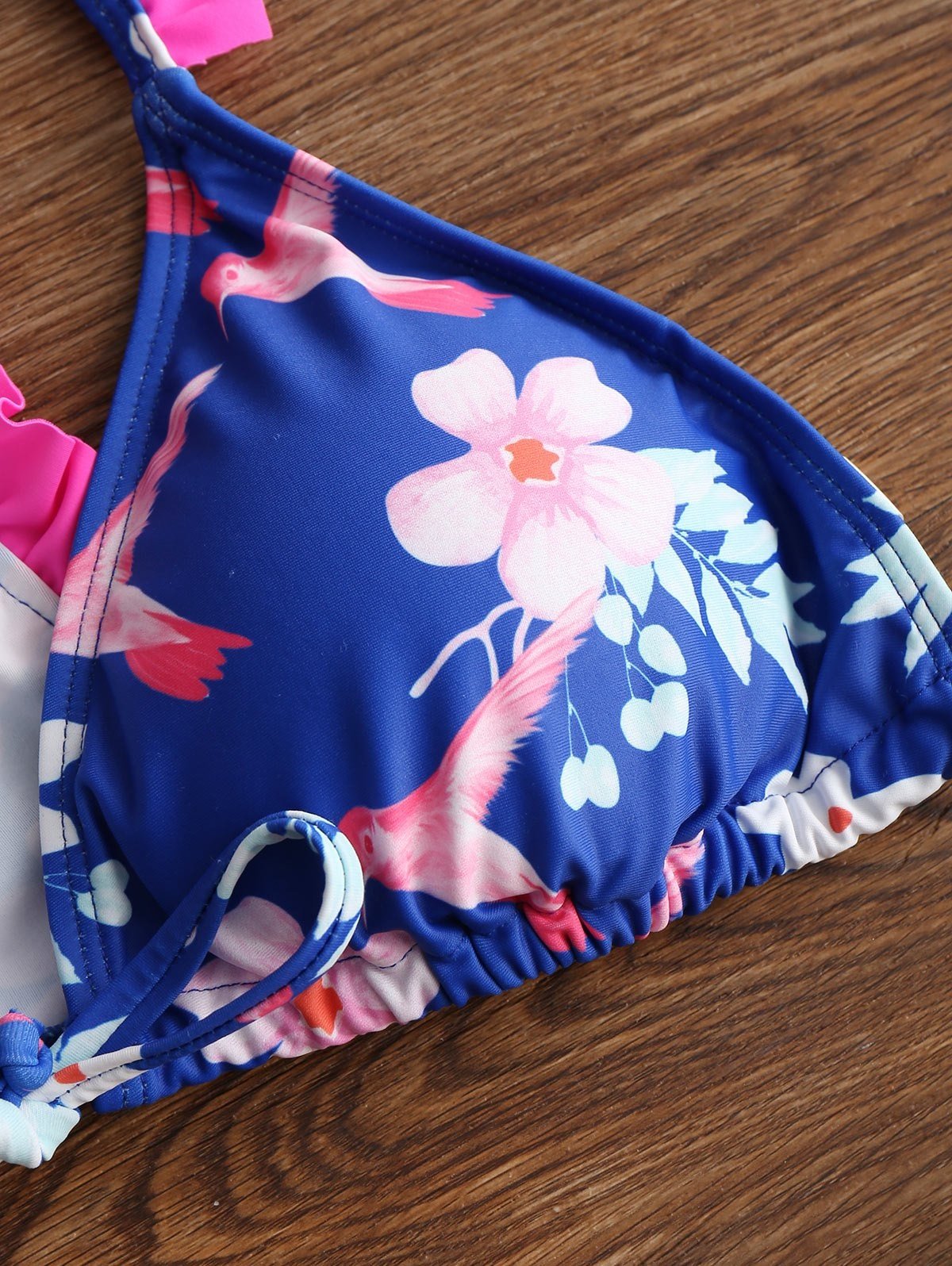 Eye-catching, cute and perfect for the beach or poolside, this frill floral bikini set is a sun-worthy addition to your swimwear. The blue bikini top keeps things vibrant with the colourful flower and bird pattern, while the adjustable tie front top showcases a chic racerback design with rose red colour flounce hem detail. Removeable sponge cups, classic bikini bottom offers ruffles trim on waistband. Pair with your favourite cover-up and get ready to hit the beach.