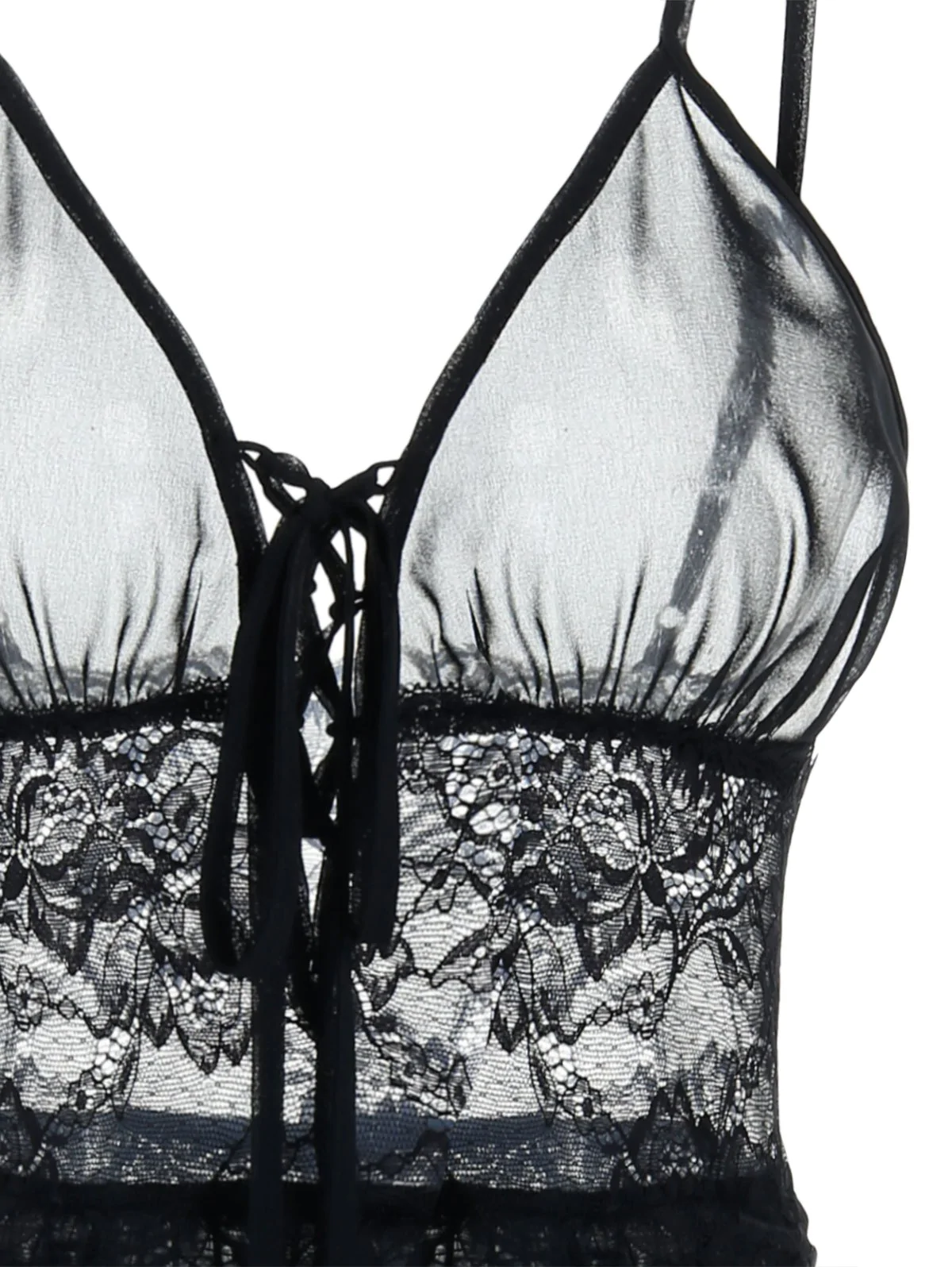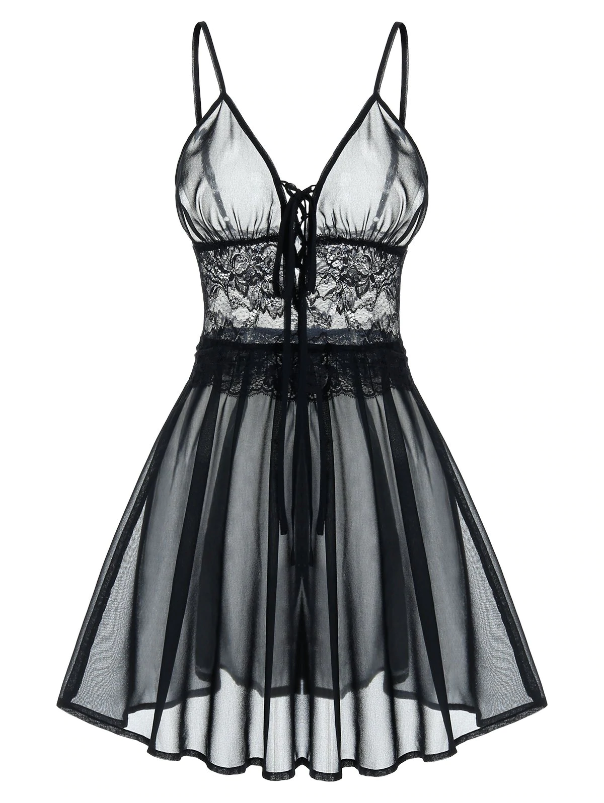Sexy Lace Up See Through Lace and Mesh Babydoll Dress