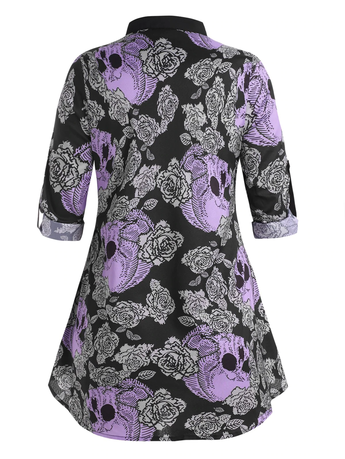 Skull Floral Two Buttoned Tab Sleeve Halloween Plus Size Blouse
