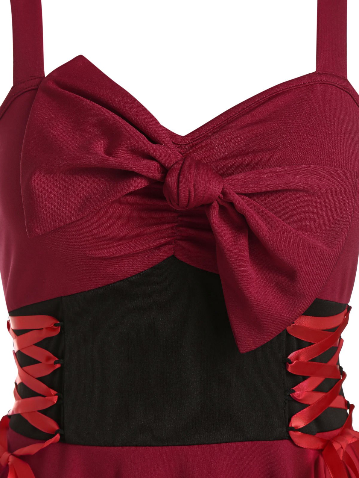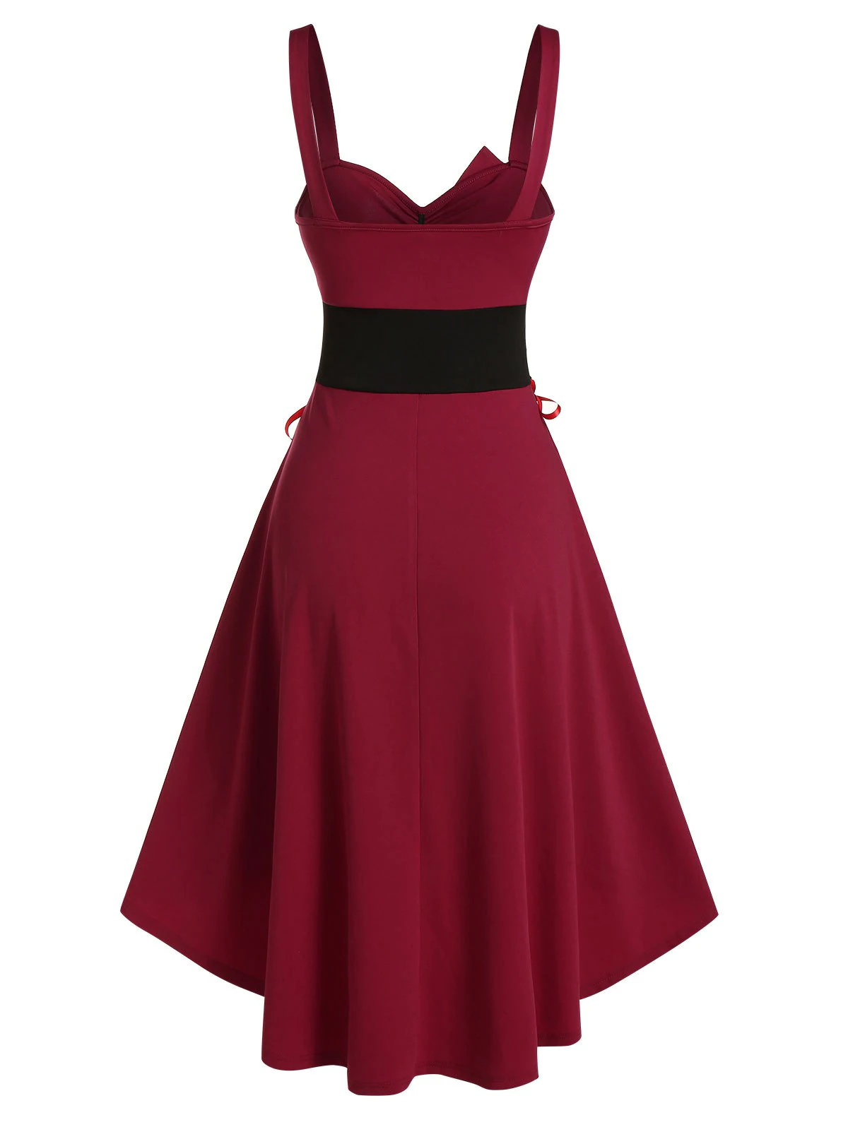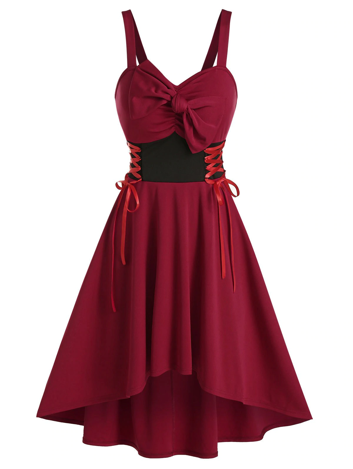 All eyes will be on you in the Dress! This party-ready dress boasts a bow, features a high empire waist, and a midi high low skirt with a flirty double lace-up design.