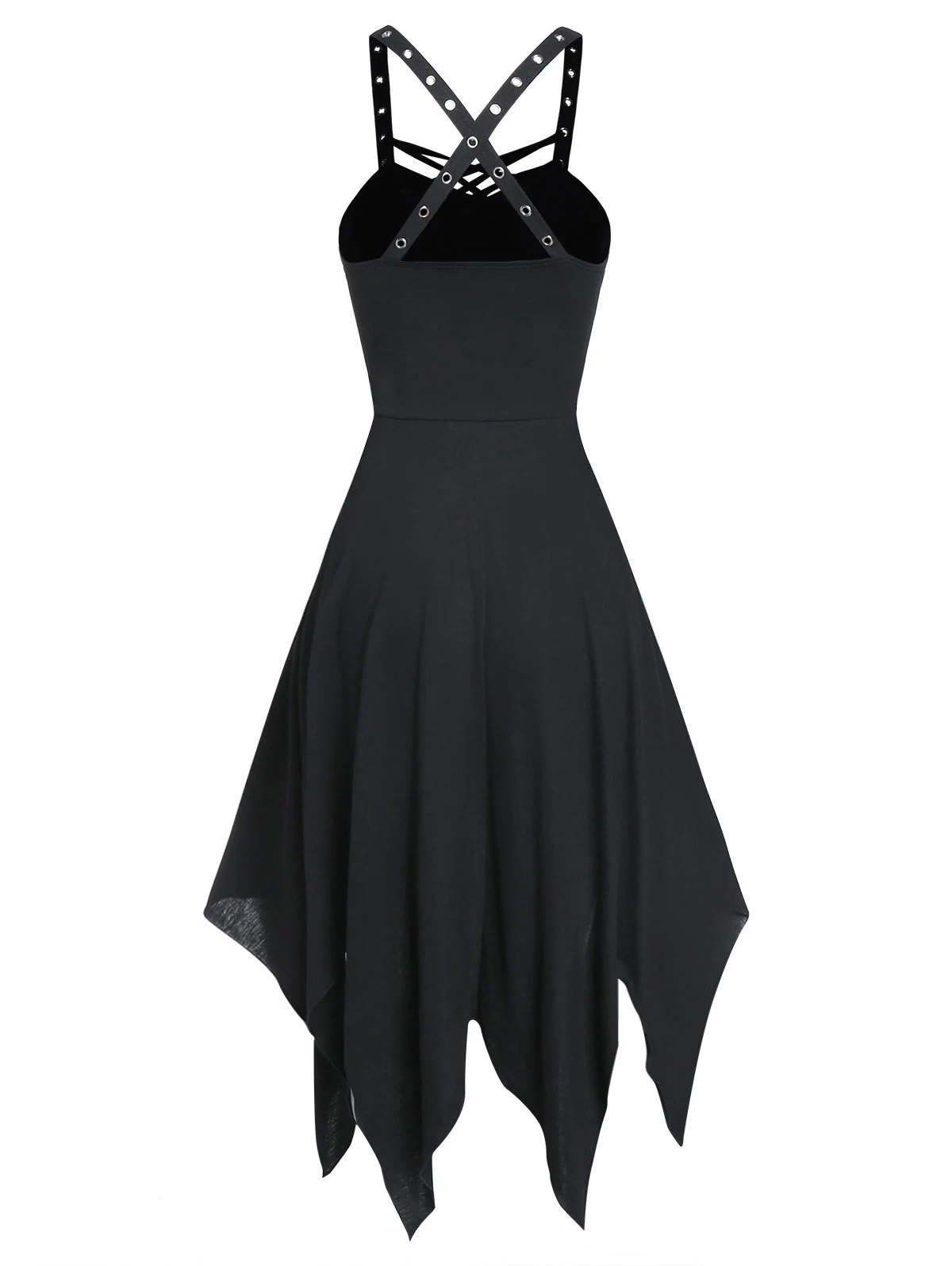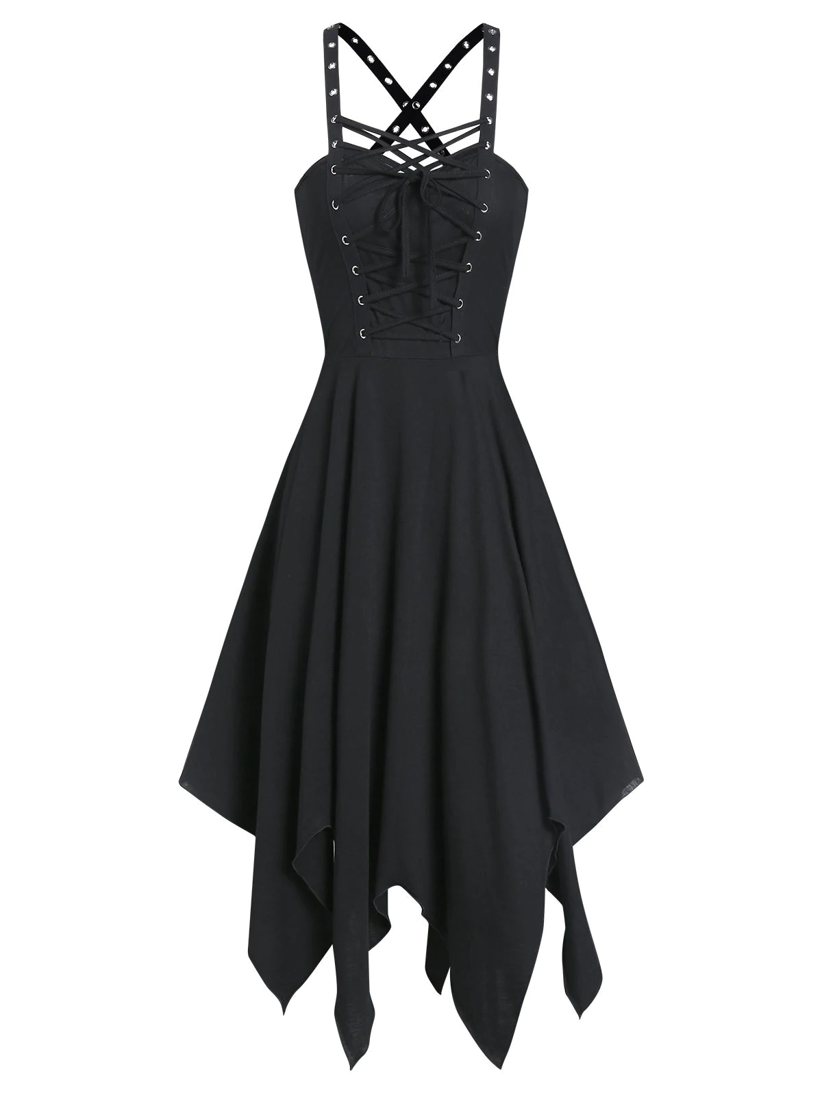Sleeveless Lace-up Front Grommet Handkerchief Gothic Dress