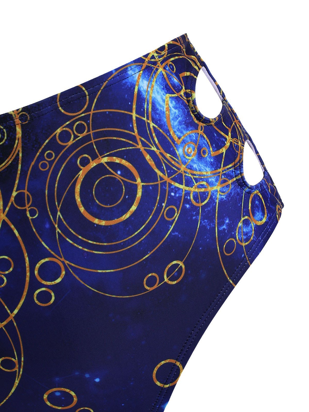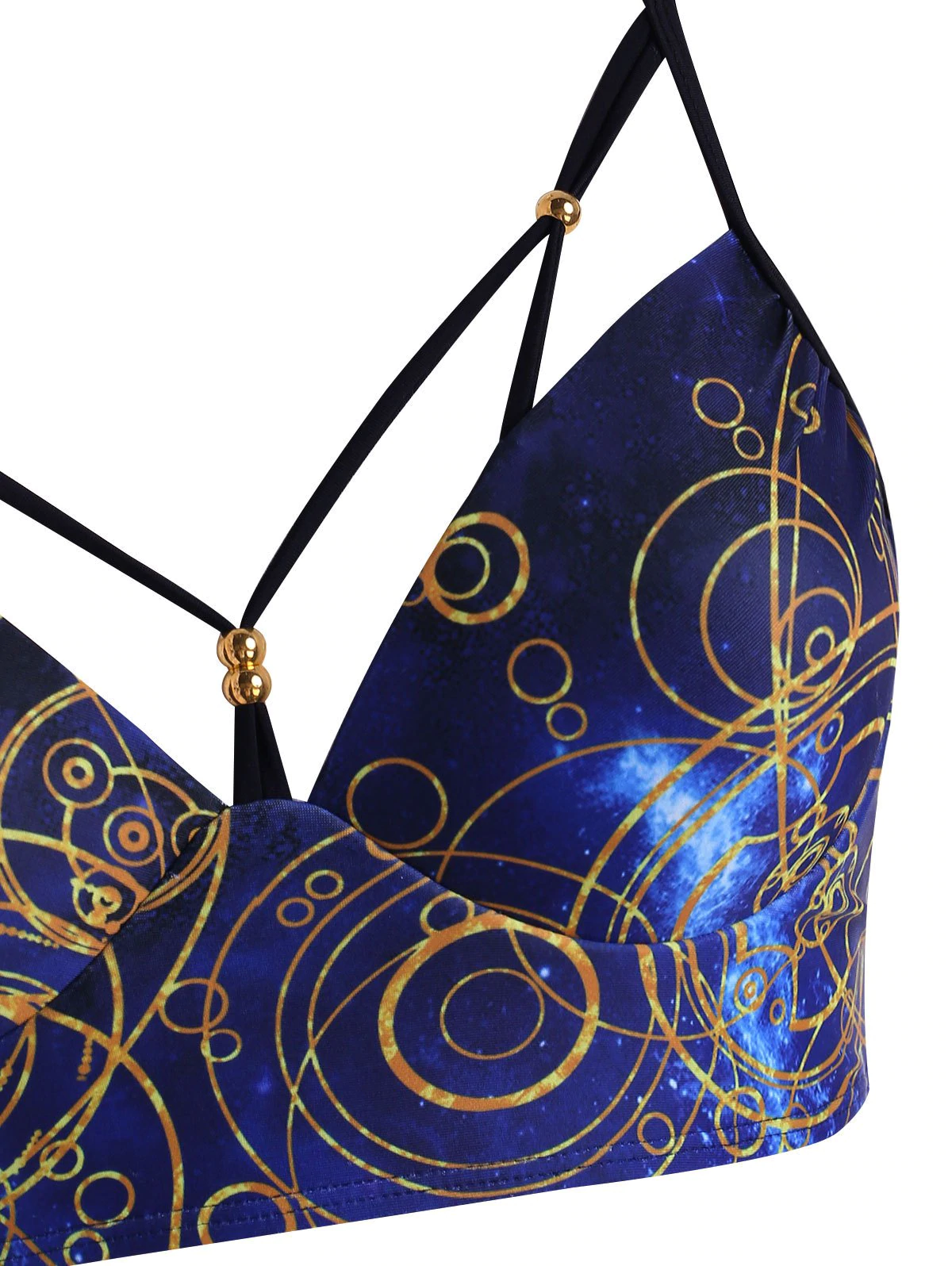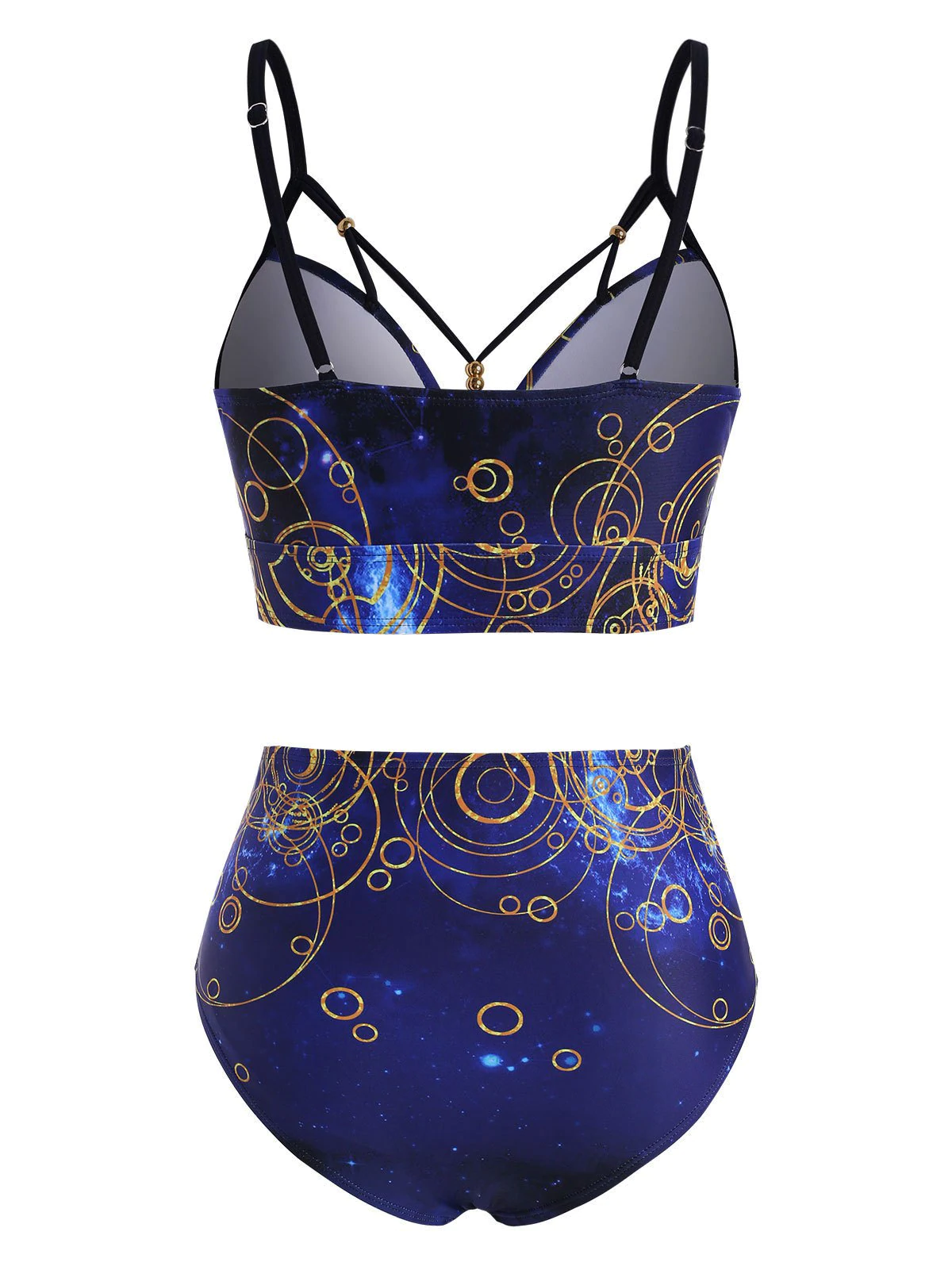 The galaxy and circle pattern makes this bikini swimwear attractive, while additional strap with beading detail appears at the center of the chest that adds decorative visual detail. And the briefs ride high on the hips and is fitted upon the waist to provide you with additional coverage.