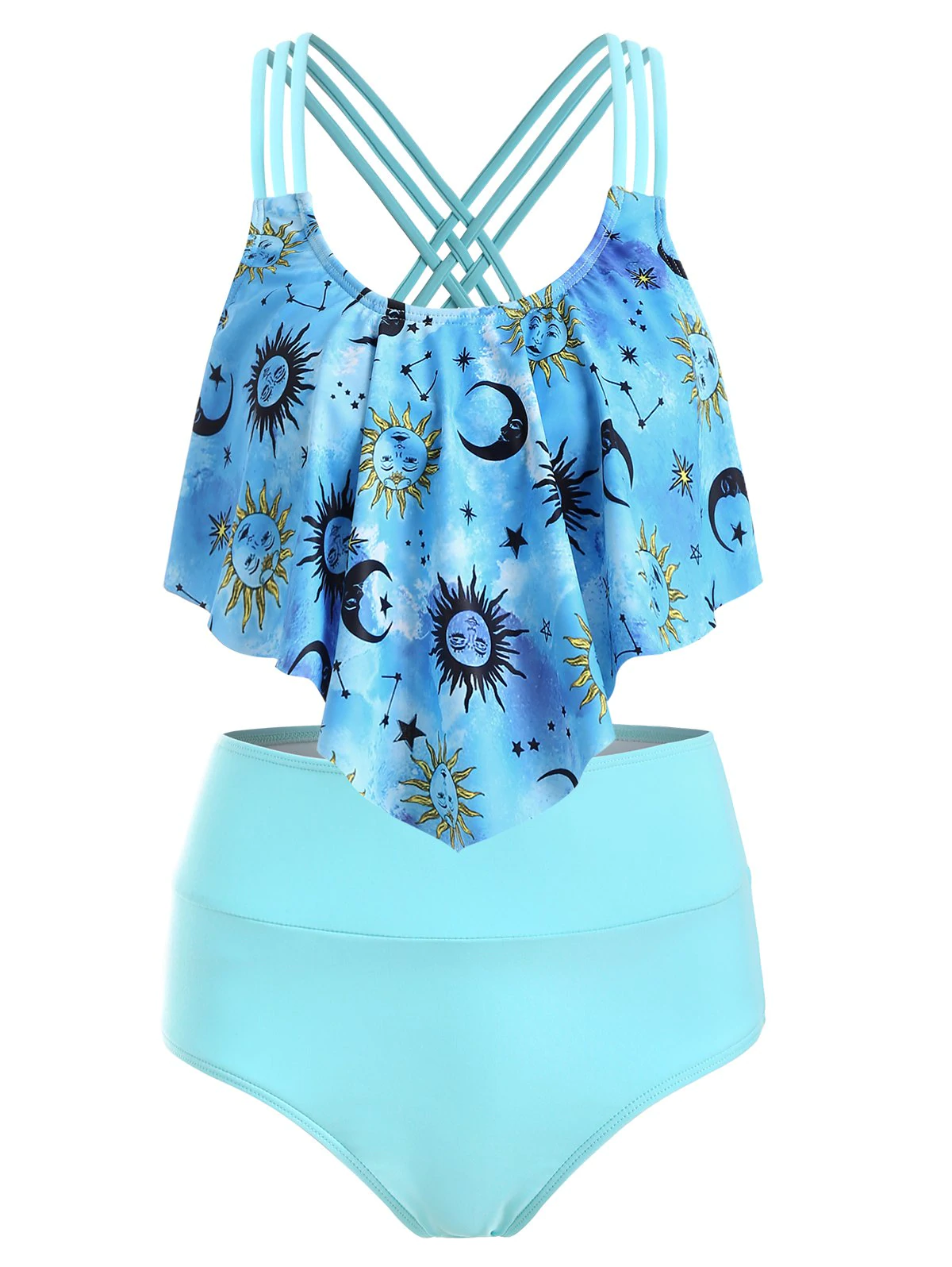 This mix and match tankini swimwear features a flounce overlay that is printed with sun, moon and star pattern. Three straps at each shoulder crisscross at the back, forming a chic strappy design. The unique scrunch butt bottom has a high rise that pulls off a very chic look.