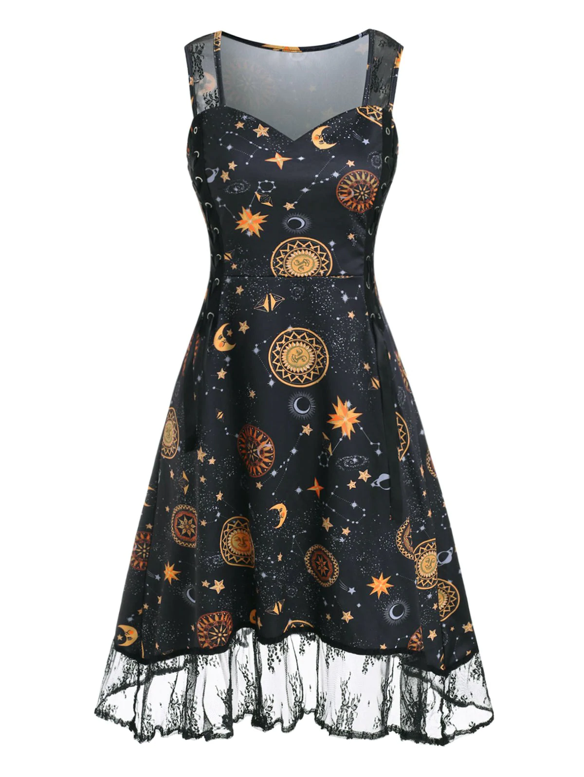 Sun, moon and stars scatter through the dress to remind you about the mystery of the sky. Feminine lace appears on the shoulder straps and hemline adds a chic look. And lace-up detail at the sides helps to create a figure-flattering silhouette.