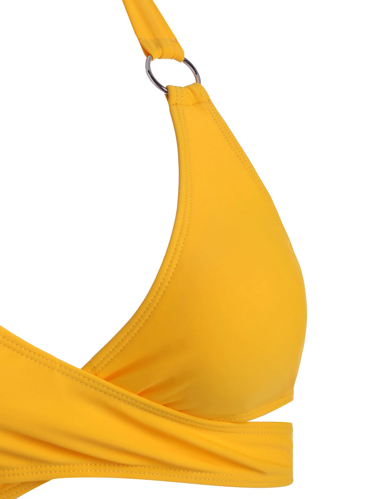 Sun, moon and star patterns are still in fashion. But if you also prefer a solid color, this mix and match bikini swimwear can meet your desire! The top is supported by halter straps which have O-rings for a chic look. And the bottom is in a high waisted design to ensure that you are covered.