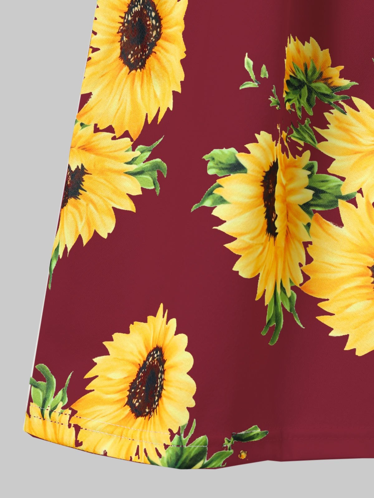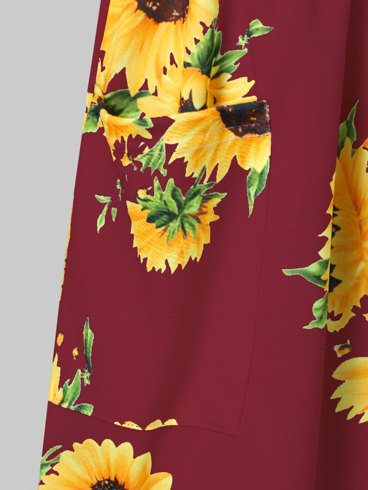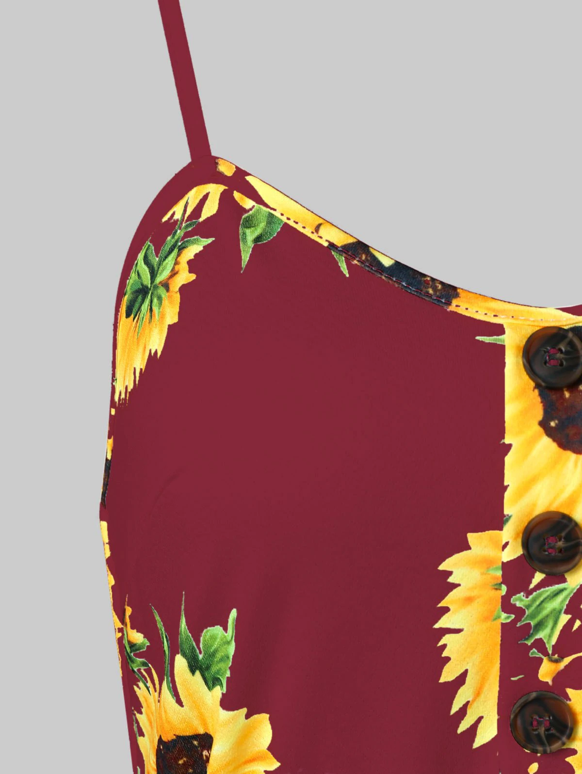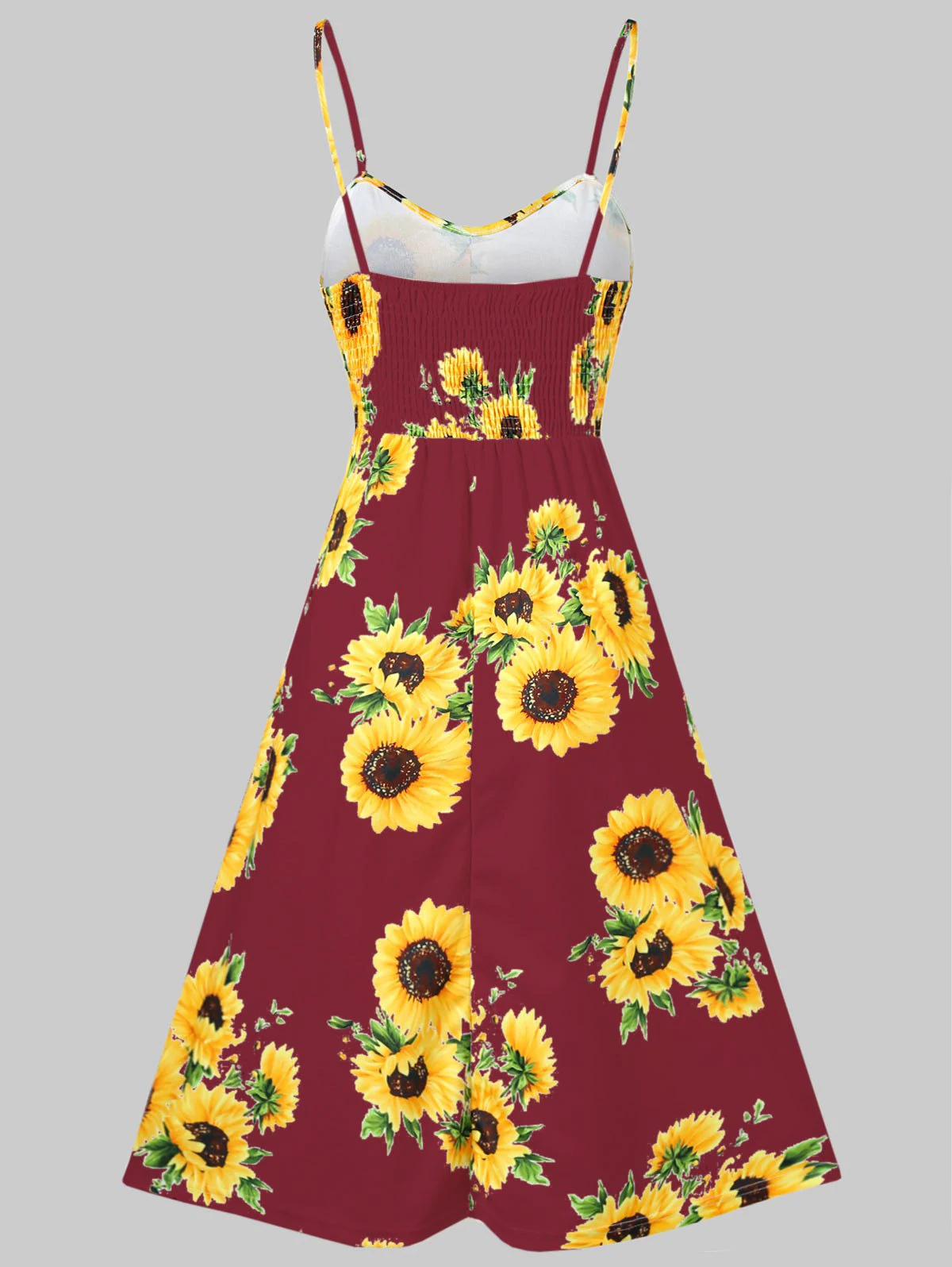 Enchanting garden sunflower blooms bring a fresh, summer-ready vibe to this spaghetti strap midi dress fashioned with slim shoulder straps and styled with a carefree button-down. Its large, opaque patch pockets add extra convenience to this bright sundress. Trendy A-line silhouette. Sleeveless cut.