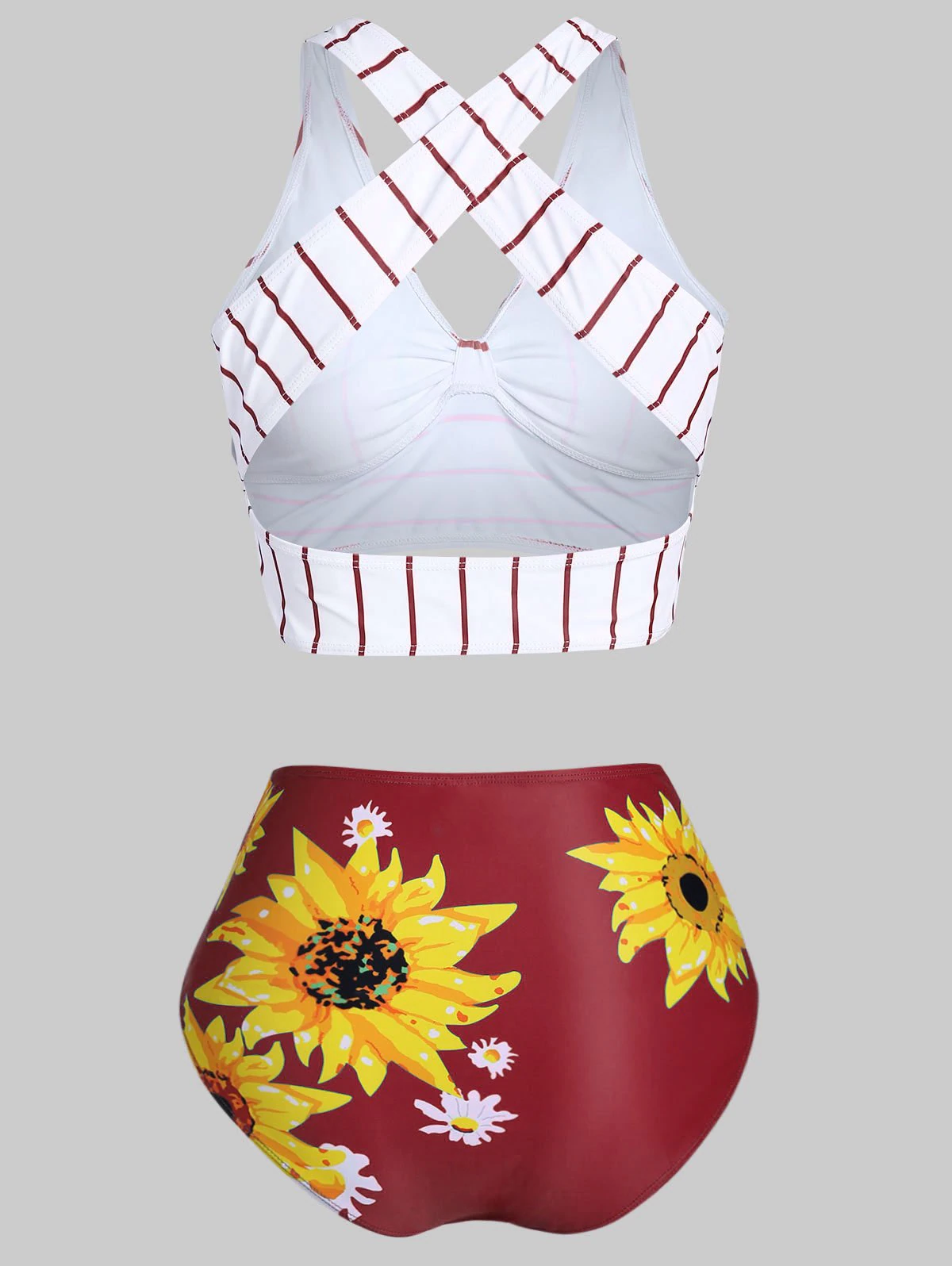 This mix and match bikini swimwear can demonstrate your powerful and tender facets while keeps you cozy. It includes a striped top that has a dangling tie to add a playful look, and a sunflower print bottom to provide a vibrant vibe.