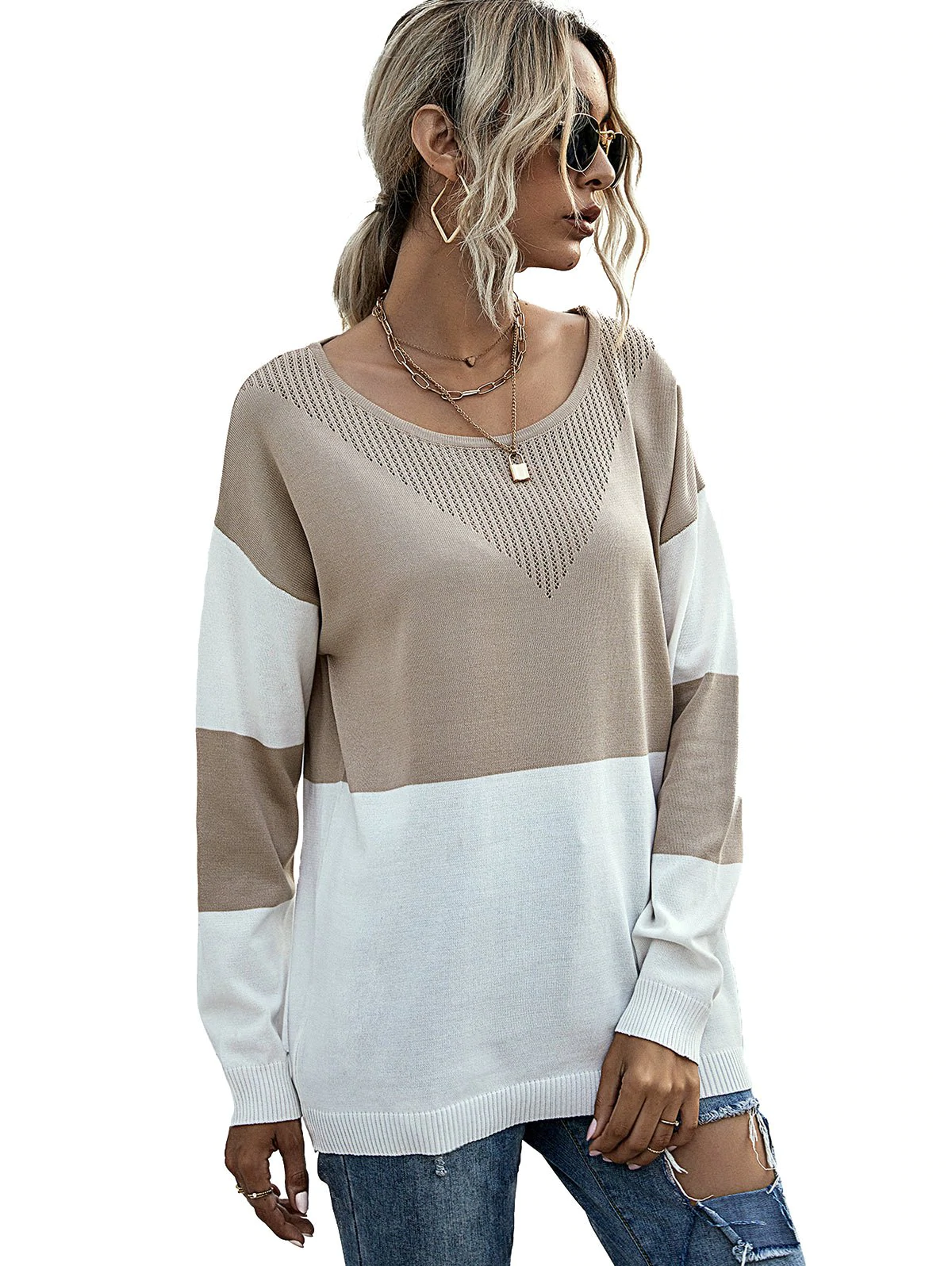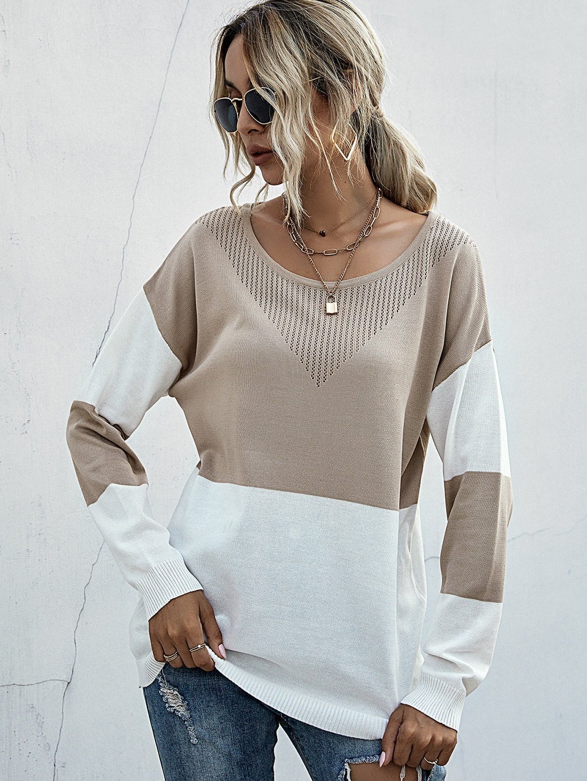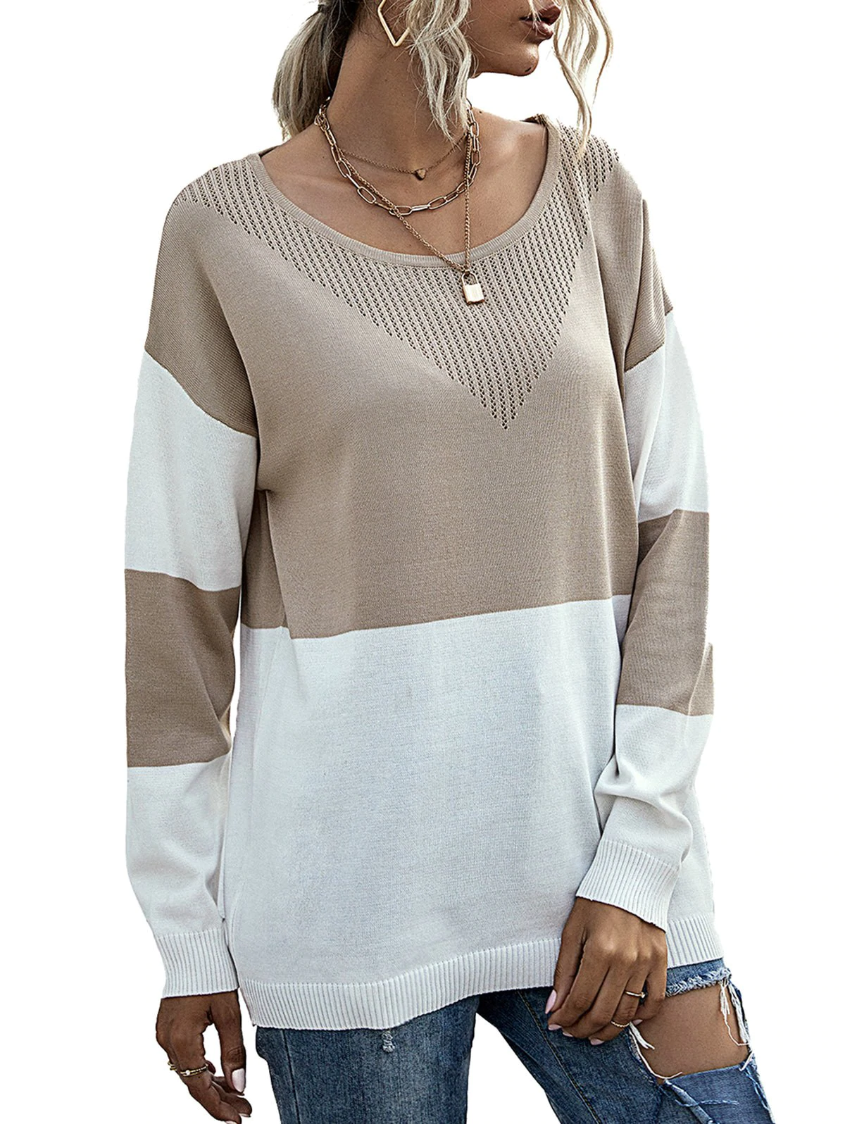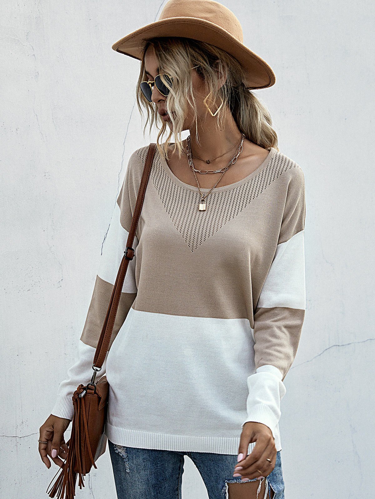 Two Tone Drop Shoulder Pointelle Knit Sweater