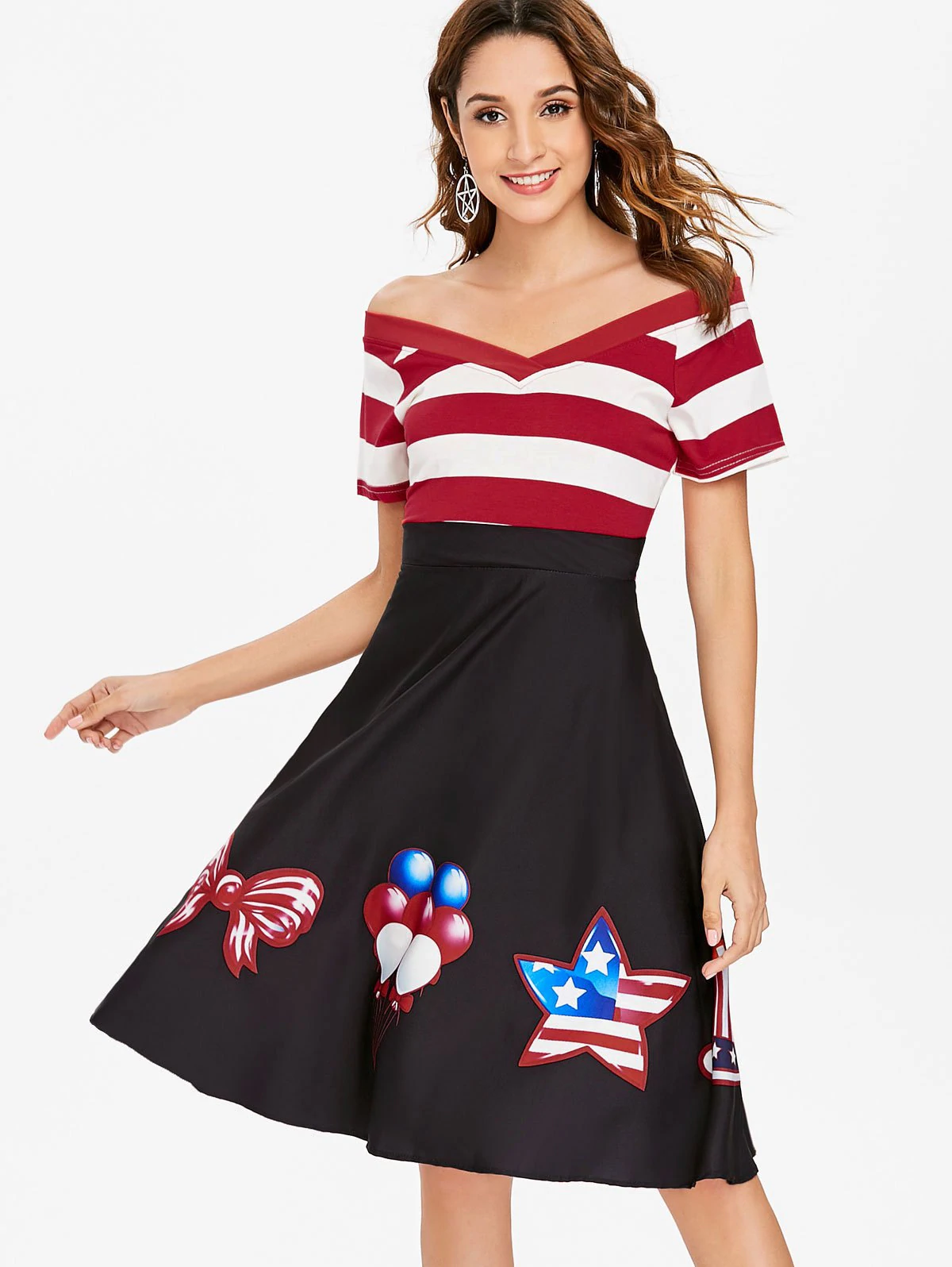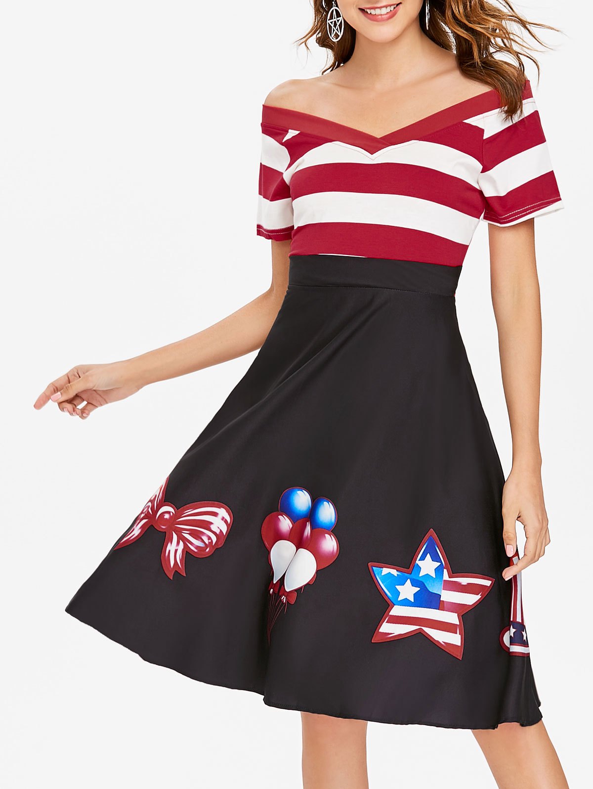This adorable dress is sure to become one of your favorites. This sweet dress features a red and white striped spliced, V-neck, short sleeve and high waisted design finished with knee-length flare skirt. Simple chic print pattern on the top part that is bowknot, balloon and American Flag star. Bring a bit of cute style to your closet, you will love this pretty dress.