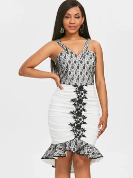 £22.790 out of 5Product Description: This two-tone bodycon dress features the use of delicate black lace crochet element and ruched design to increase feminine chic side. Slim fit silhouette. Cool sleeveless design can be more suited for wearing in the summer. Style: Sexy & Club Material: Polyester Silhouette: Bodycon Dresses Length: Knee-Length Neckline: V-Neck Sleeve Length: Sleeveless Pattern Type: Floral With Belt: No Season: Summer Weight: 0.4800kg