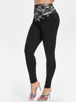 Mock Button Lace Insert High Waist Leggings