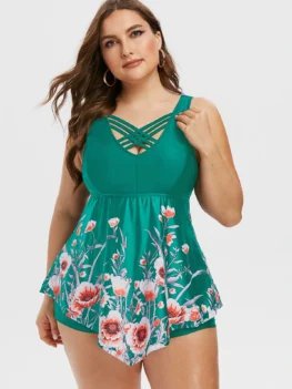 Plus Size Floral Print Strappy Padded Skirted Tankini Swimwear