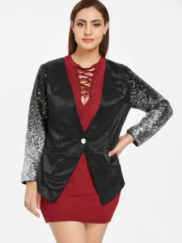 $73.430 out of 5Create polished looks in this black glitter blazer. A trendy coat made with a structured silhouette. The flattering blazer has long sleeve with shining sequin embellished, and one button closure at the front, finished with front slash pockets. Clothes Type: Others Material: Polyester Type: Wide-waisted Shirt Length: Regular Sleeve Length: Full Collar: Collarless Pattern Type: Patchwork Style: Fashion Season: Fall,Winter Weight: 0.4800kg Package…