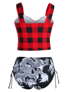 Plus Size Plaid Dragon Print Oriental Tie Tankini Swimwear