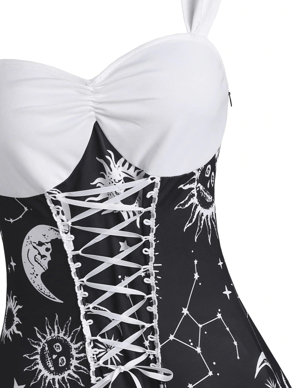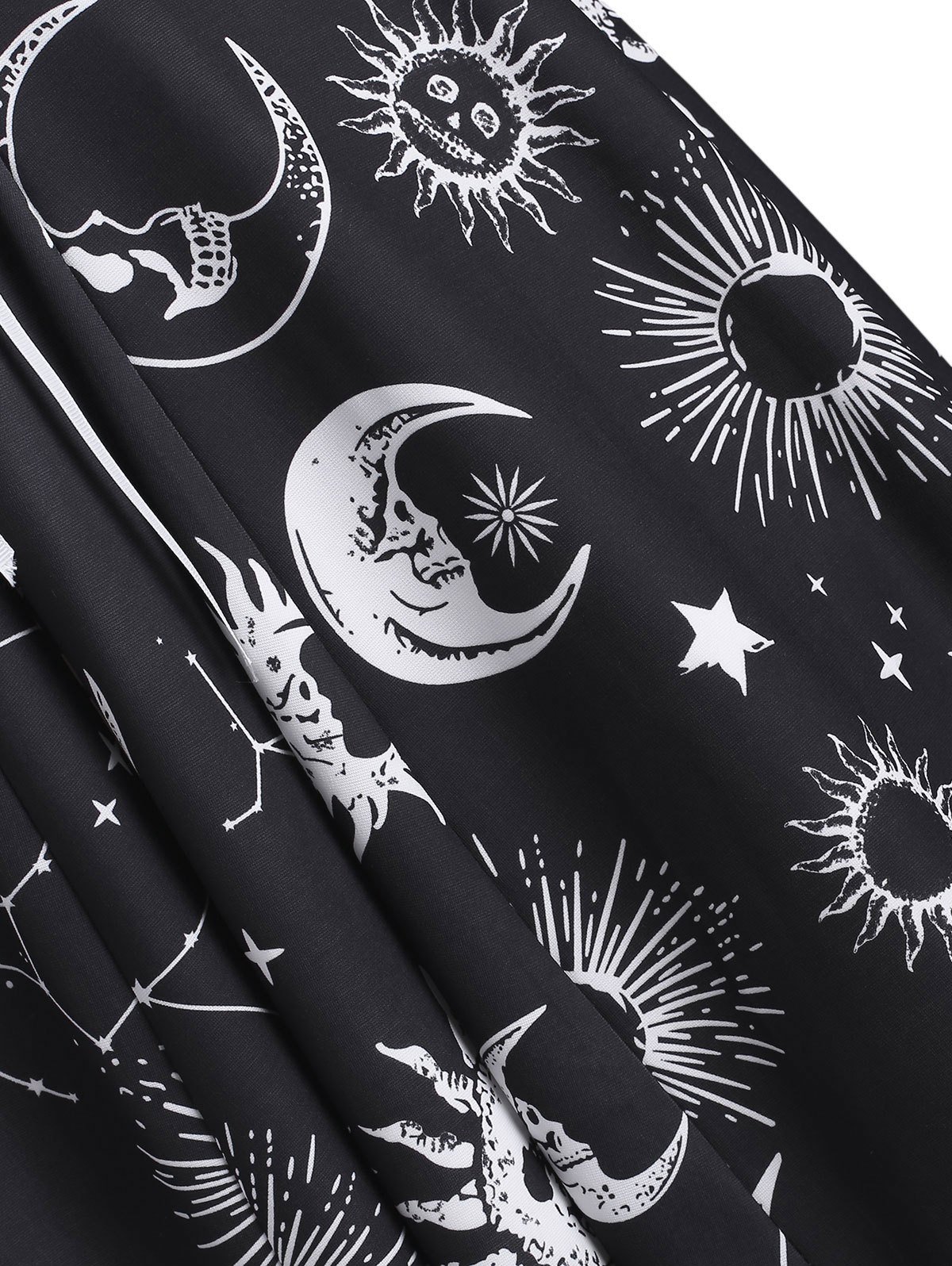 This sleeveless dress is printed with a sun, moon, and stars pattern which is in fashion now. The chic lace-up design helps to highlight your slim waist, as well as accentuating your bust shape. And the ruched sweetheart neckline is fun and unique to make sure that you will not be ignored.